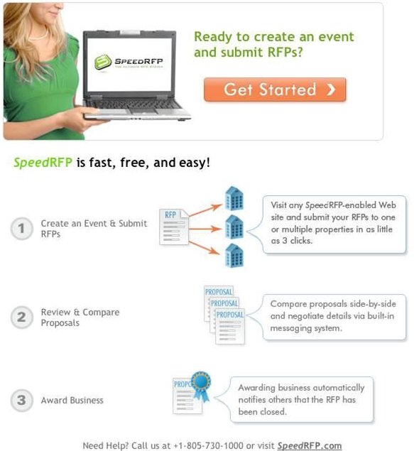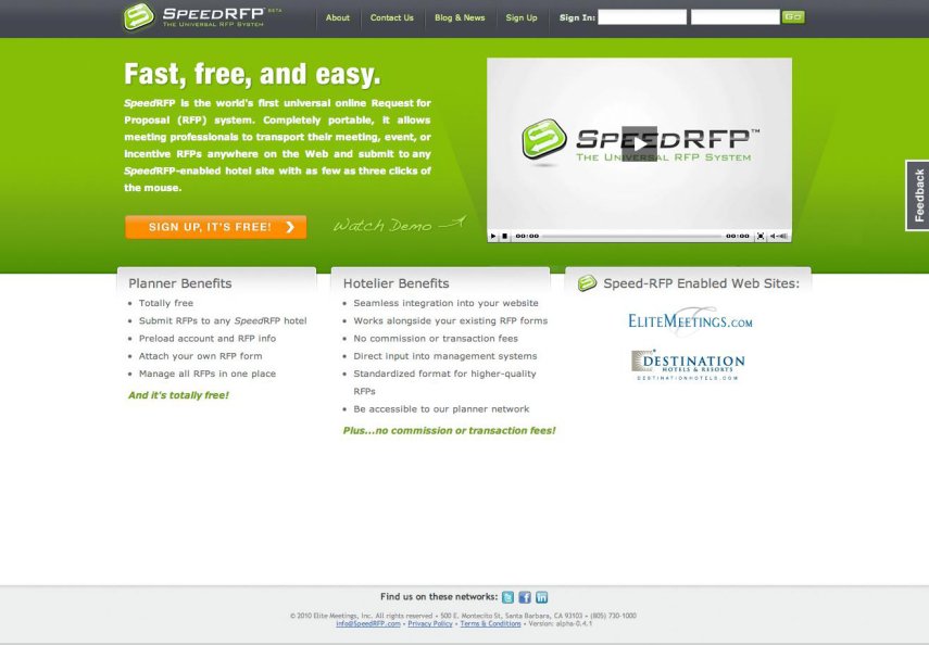 Santa Barbara, CA, April 27, 2010 – SpeedRFP (www.SpeedRFP.com) - a new product for creating, submitting and tracking RFPs online - has officially launched, generating RFPs for meetings planners and hotels in the U.S. and internationally. As it gains in adoption, planner input continues to be gathered to shape SpeedRFP into a game-changer for the industry in the months ahead. Created and introduced by Elite Meetings International, Inc., the innovator in online solutions for the hotel and meeting industries, SpeedRFP is a completely portable and seamless RFP technology that is fully APEX-compliant. Any hotel can download the Community Edition at no charge, and it is free to meeting professionals, from whom it is already drawing enthusiastic support. Click Here to View SpeedRFP Video SpeedRFP is being used as a primary online RFP solution by Destination Hotels & Resorts (www.DestinationMeetings.com); additional integrations will soon be announced by other leading hotel chains, independent hotels, CVBs, hotel consortiums, and other hotel guide websites. Online SpeedRFPs are also being submitted to hotels via www.AmexMeetingPlanner.com and www.EliteMeetings.com.
